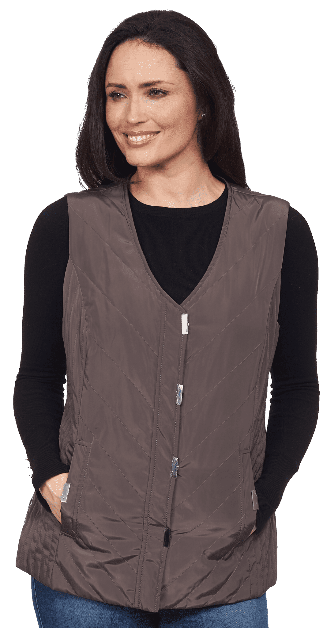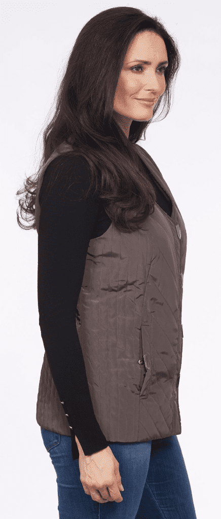 This luxury lightly padded iridescent fabric plus size gilet comes with stud fastening pockets for your belongings. It closes with stud front fastening too. It is fully lined and machine washable for added convenience, meaning it can be worn on long walks in the forest. A great piece for country lovers or city dwellers.